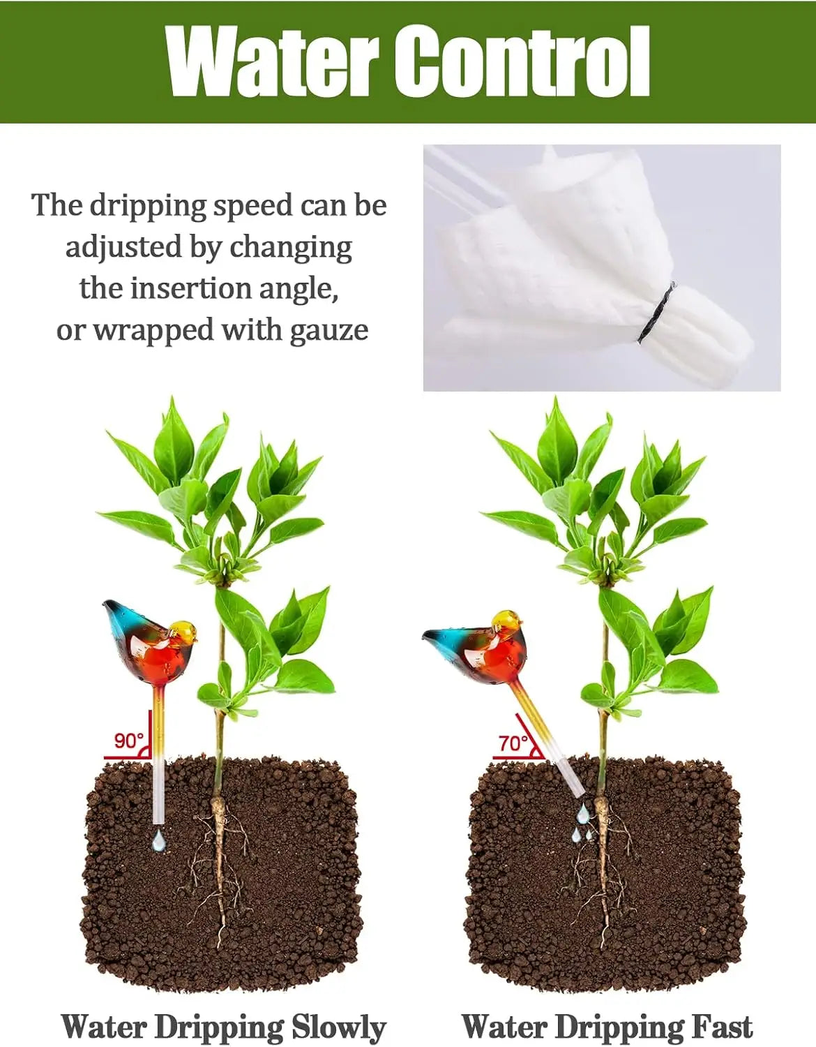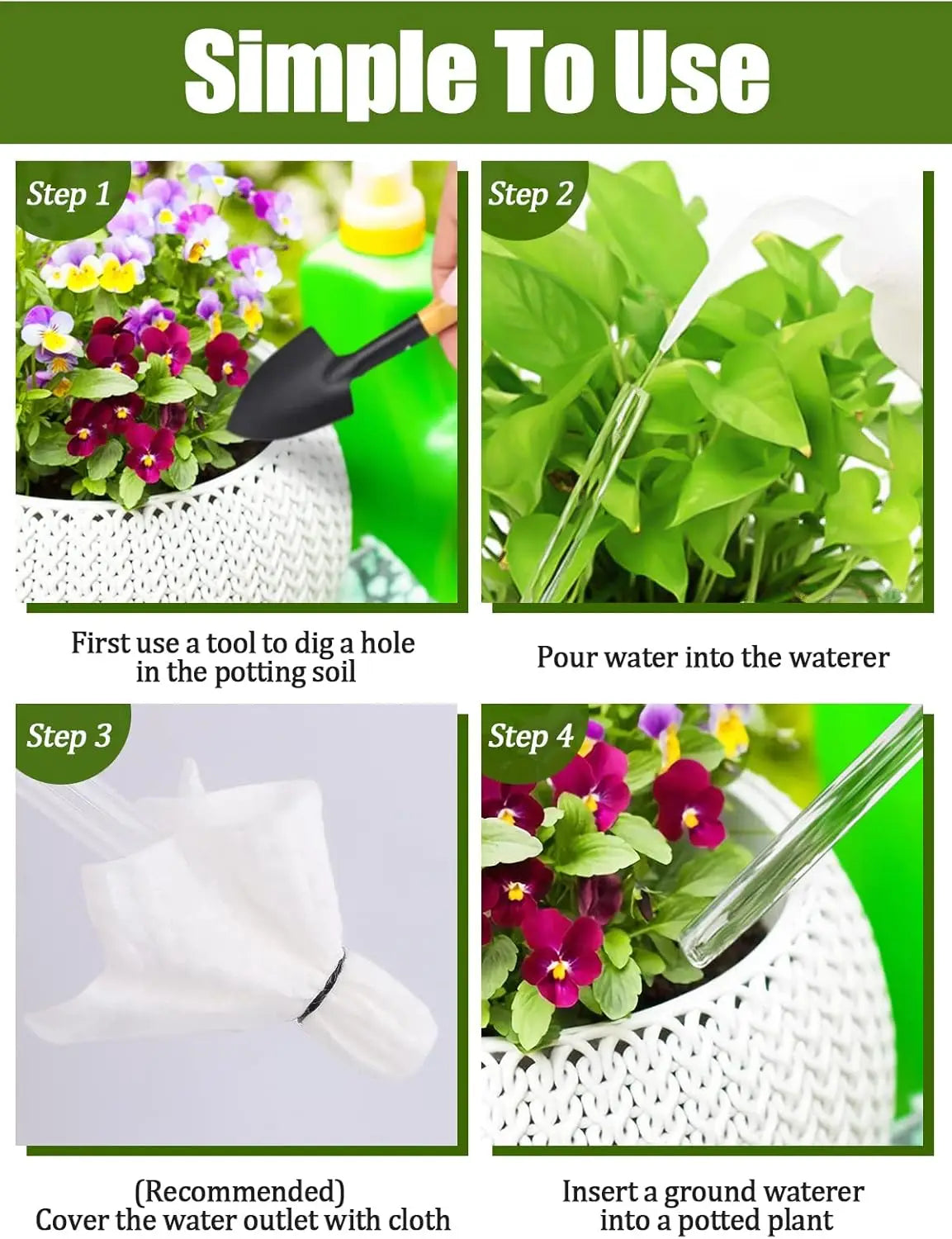 Pre-water the soil, fill the globe, then insert the stem at a 45° angle so the tip sits near the root zone. This prevents air locks and overwatering.